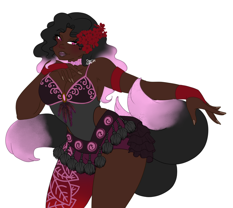 and so she grew up. any questions about her past were answered, and thus she never felt the need to run to search for the people who left her behind. “why would i search for the ilk who couldn’t give a shit, when i got my whole family right here?” magic colored her entire life, and yet she set to help out those who did not, could not have magic of the same kind of their own. she was their mechanic, after a time of watching others take care of it off and on. she was smart then, and still is now, enough so that she had her grand debut when she was just turning 18 years old, with two shining black and pink tails and being declared “the soul of the circus”…& at that moment in time, more than just the living were cheering her on. as her eyes had become too clear, and her vulpine ears unclogged with the life of the mortal realm. the dead found her, and they’d found her wit & charm refreshing.